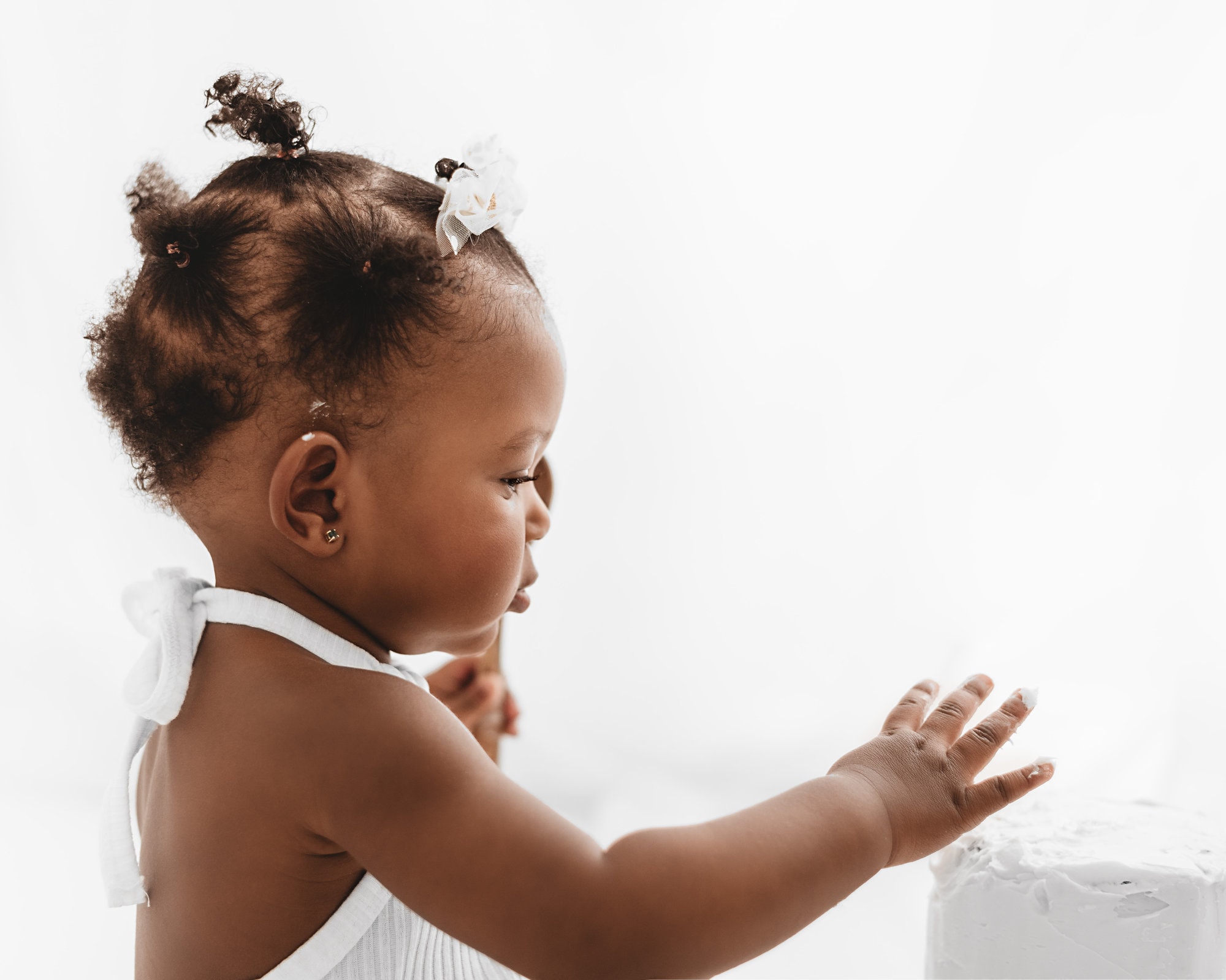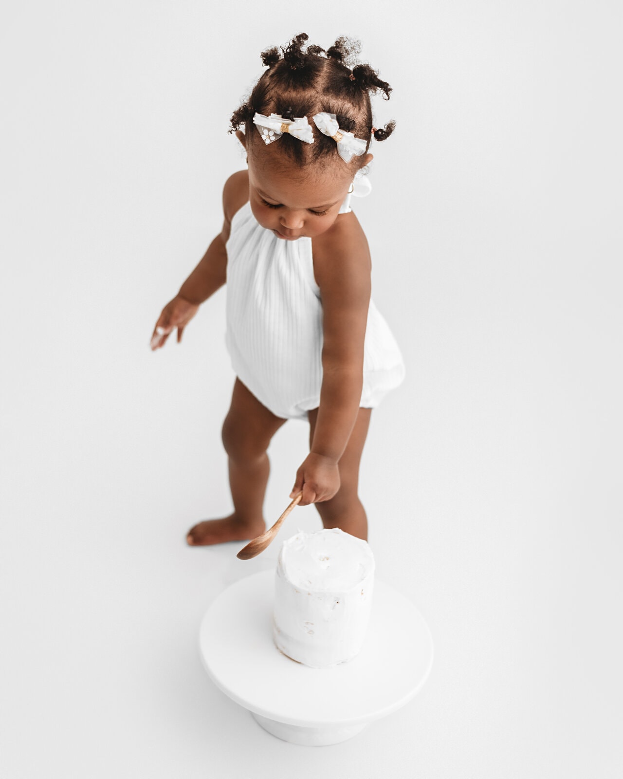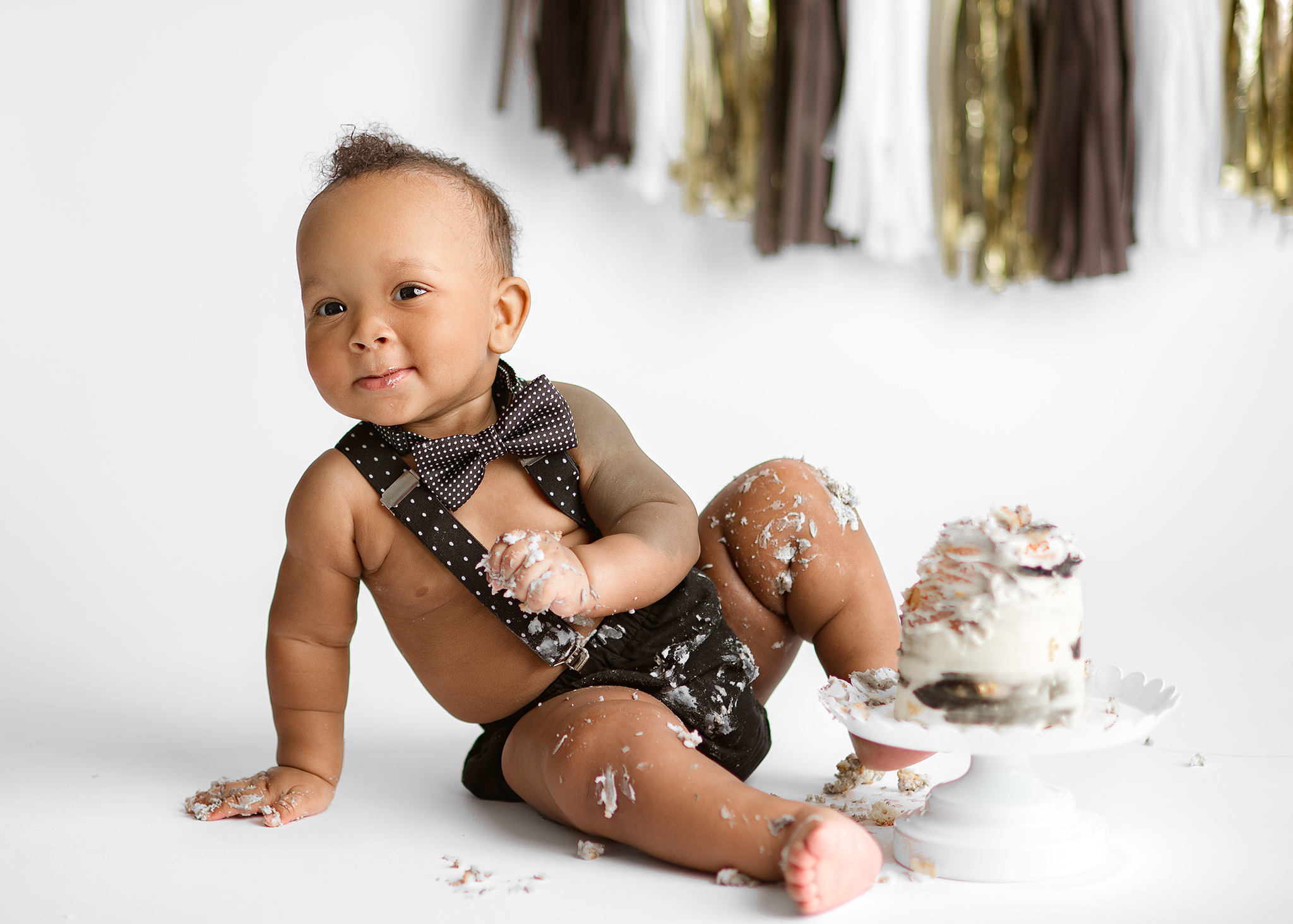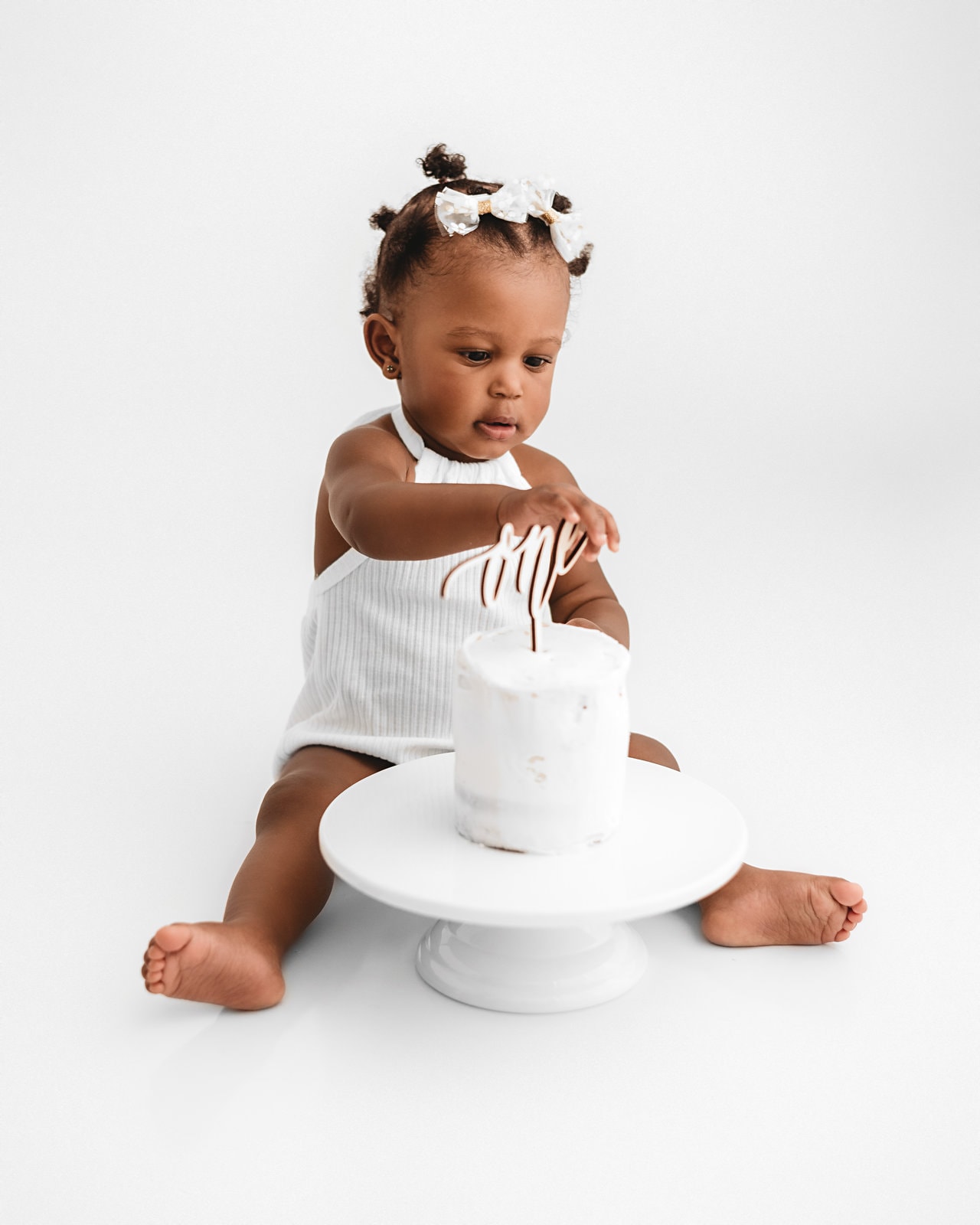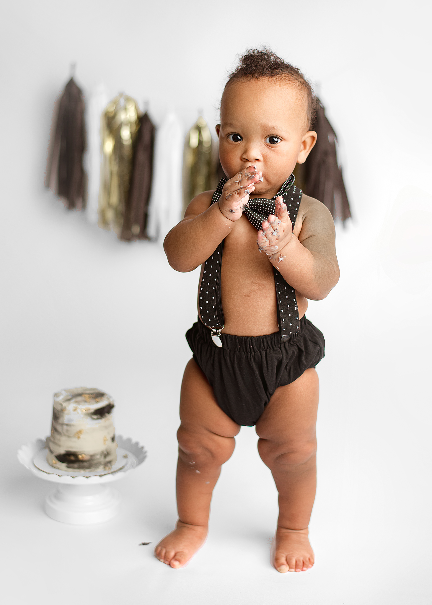Cake Smash Packages include everything needed for your little one: A naked vanilla cake* from a local baker, coordinating topper, session time from beginning to end, wardrobe use, and monochromatic milestone portraits before the cake smash.